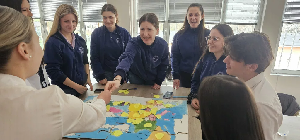 След приветствените слова на старшите посланици и запознанството на младшите посланици започна следващия етап от нашата инициатива. Учениците бяха разделени на два отбора и получиха предизвикателството да сглобят ръчно изработени карти–пъзели на ЕС. С всяко поставено парче те не просто откриваха държавите членки, а проследяваха историята на разширяването на Съюза – стъпка по стъпка, година след година. В атмосфера на ентусиазъм, сътрудничество и приятелско съревнование младите участници показаха, че знанието може да бъде вдъхновяващо преживяване.