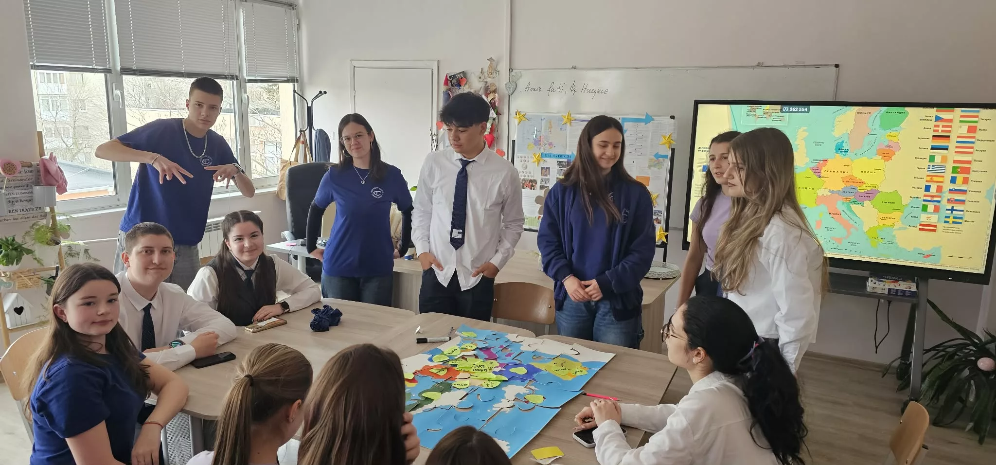 Учениците бяха разделени на два отбора и получиха предизвикателството да сглобят ръчно изработени карти–пъзели на ЕС. С всяко поставено парче те не просто откриваха държавите членки, а проследяваха историята на разширяването на Съюза – стъпка по стъпка, година след година. В атмосфера на ентусиазъм, сътрудничество и приятелско съревнование младите участници показаха, че знанието може да бъде вдъхновяващо преживяване. Те доказаха, че когато работят заедно, границите изчезват, а Европа се превръща в споделена идея и общ дом.