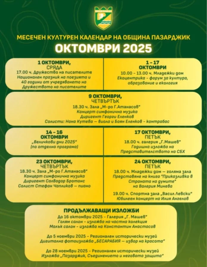 Община Пазарджик обяви месечния си културен календар за Октомври 2025 г., който включва поредица от концерти, изложби, литературни събития и инициативи, насочени към изкуството, образованието и екологията.