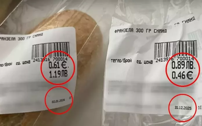 Приведен беше пример за хляб „Франзела Симид“ (300 гр.), който е закупен от голяма търговска верига. На 31 декември 2025 г. цената му е била 0,89 лв. (0,46 евро). На 2 януари 2026 г. същият артикул вече струва 0,61 евро (1,19 лв.). Това е скок от 33% само в рамките на два дни – нещо, което трудно може да бъде обосновано.