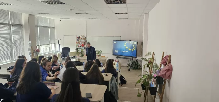 По увлекателен и интересен начин той запозна учениците с основните институции на Европейския съюз и техните функции, както и с техните председатели, като насърчи тяхната активност и любопитство по темата. Младшите посланици също проявиха голям интерес, като активно се включиха в дискусията – задаваха въпроси и уверено отговаряха на поставените към тях, което допринесе за по-динамична и ползотворна среща.