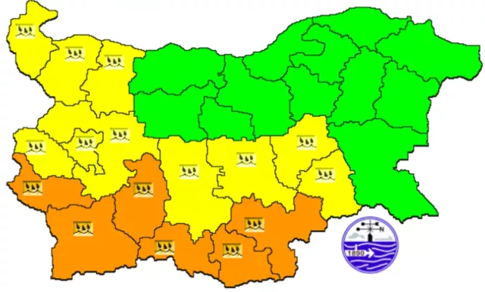 Жълт и оранжев код е обявен за значителни валежи в половин България, съобщиха от Националния институт по метеорология и хидрология (НИМХ).