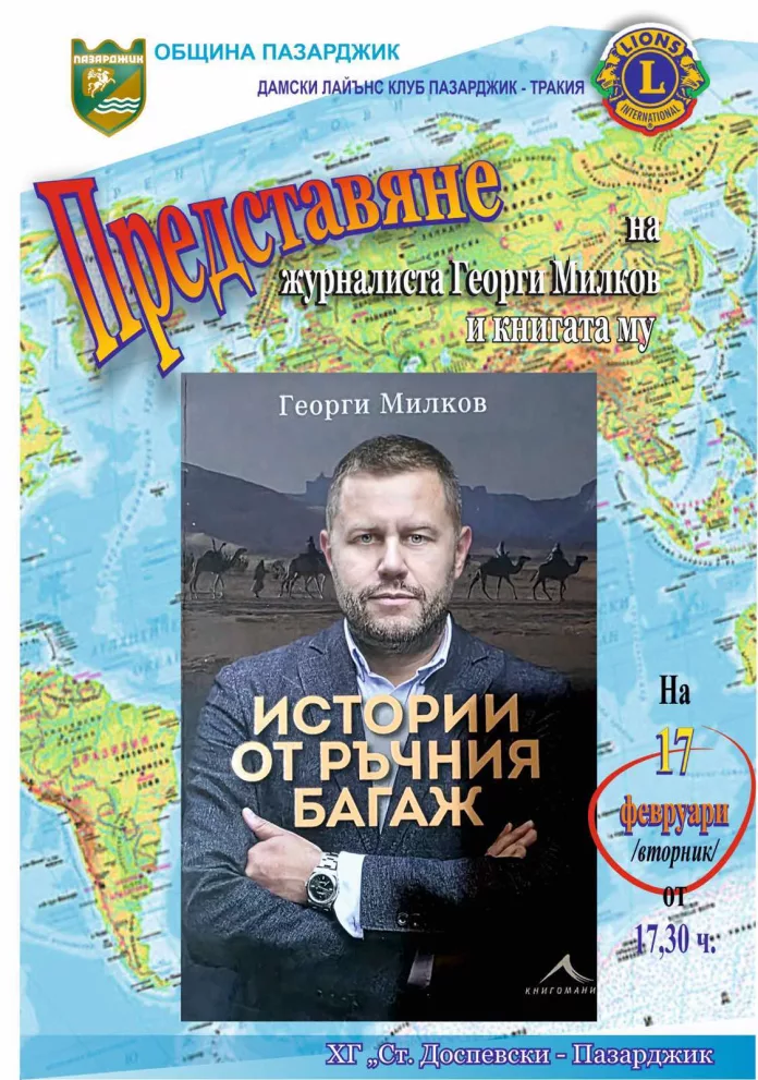 Община Пазарджик кани всички почитатели на литературата и публицистиката на среща-разговор с журналиста Георги Милков, който ще представи своята книга „Истории от ръчния багаж“.
