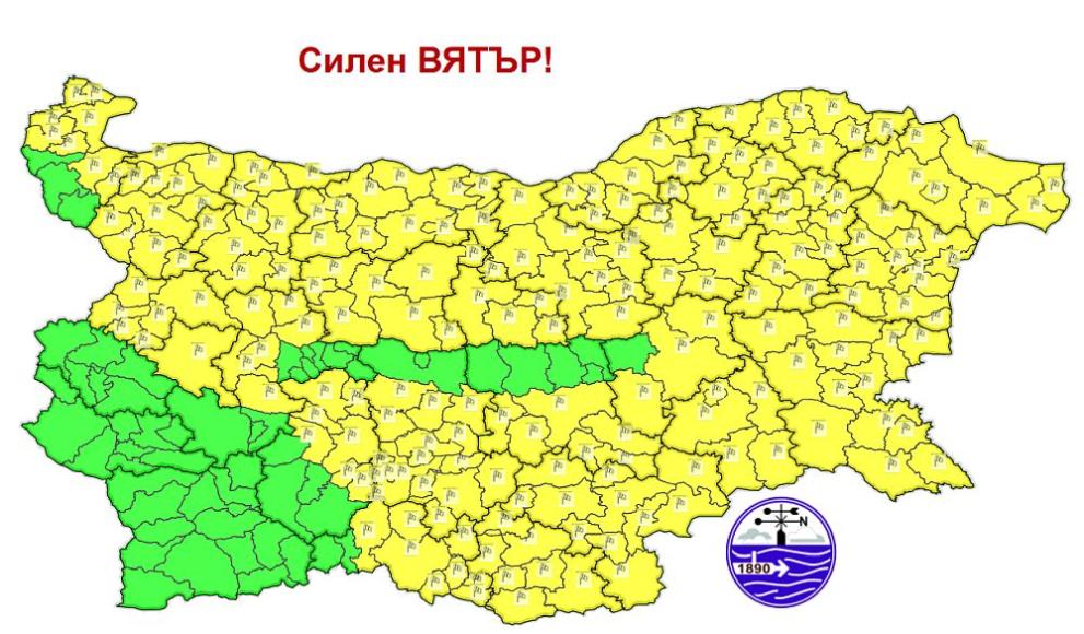 Днес ще е облачно и от запад на изток ще има валежи от дъжд. След обяд ще спират, най-късно в югоизточните райони и облачността ще се разкъсва. Максималните температури ще бъдат между 19° и 24°. Обявен е и жълт код за потенциално опасно време -ветровито. Вятърът ще се ориентира от запад-северозапад, ще е умерен, в Дунавската равнина и Горнотракийската низина – силен. Кодът е в сила за цялата страна, с изключение на Перник, Кюстендил и Благоевград.